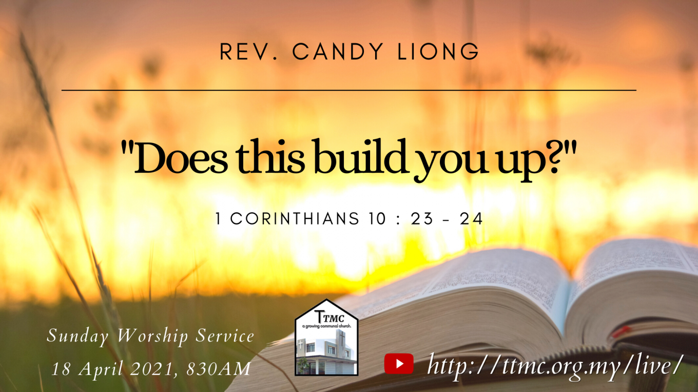 Read MoreDate: 18.04.2021 Time: 8:30AM Preacher: Rev. Candy Liong Scripture Verses: 1 Corinthians 10:23-24 Sermon: “Does this build you up?” Worship