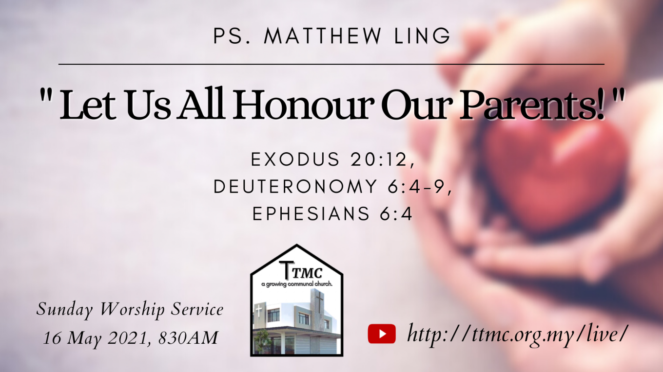 Date: 16.05.2021 Time: 8:30AM Preacher: Ps. Matthew Ling Scripture Verses: Exodus 20:12, Deuteronomy 6:4-9, Ephesians 6:4 Sermon: Let Us All