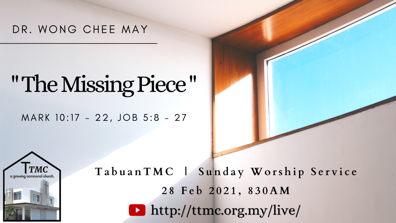 Read MoreDate: 28.02.2021 Time: 8:30AM Preacher: Dr. Wong Chee May Scripture Verses: Mark 10:17-22, Job 5: 8-27 Sermon: “The Missing Piece”