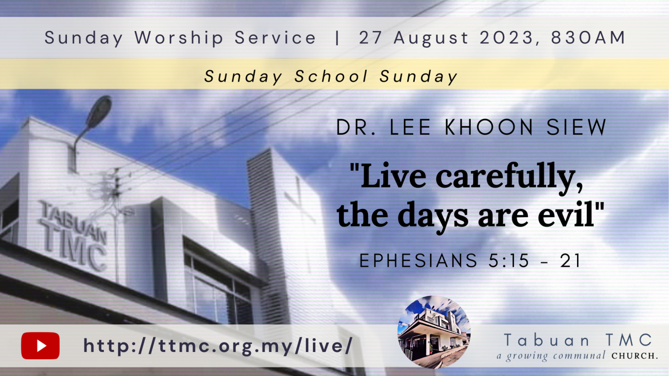 Read MoreDate: 27.08.2023 Time: 8:30AM Preacher: Dr. Lee Khoon Siew Scripture Verses: Ephesians 5:15 – 21 Sermon: “Live carefully, the days