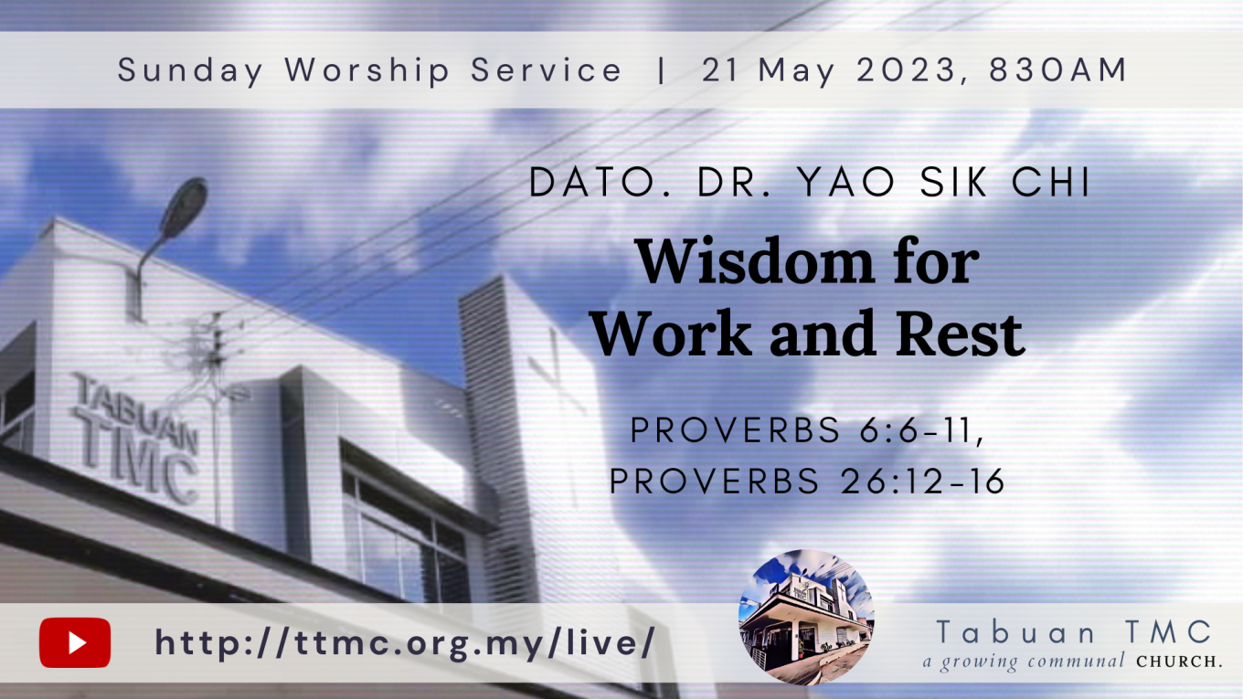 Read MoreDate: 21.05.2023 Time: 8:30AM Preacher: Dato. Dr. Yao Sik Chi Scripture Verses: Proverbs 6:6-11, Proverbs 26:12-16 Sermon: Wisdom for Work