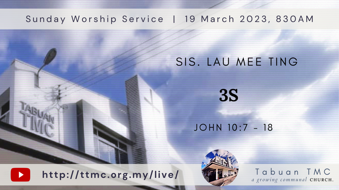 Read MoreDate: 19.03.2023 Time: 8:30AM Preacher: Sis. Lau Mee Ting Scripture Verses: John 10:7 – 18 Sermon: 3S Worship Songs: What