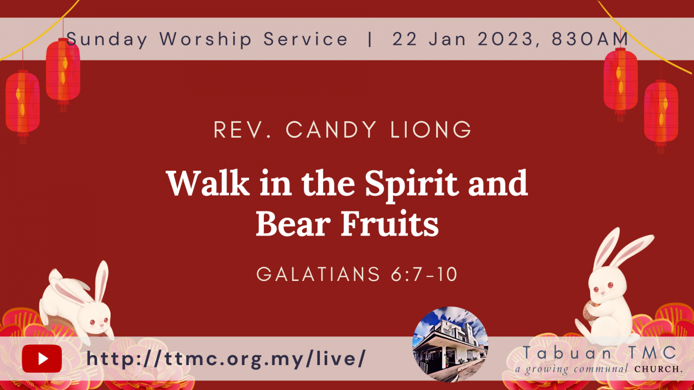 Read MoreDate: 22.01.2023 Time: 8:30AM Preacher: Rev. Candy Liong Scripture Verses: Walk in the Spirit and Bear Fruits Sermon: Galatians 6:7
