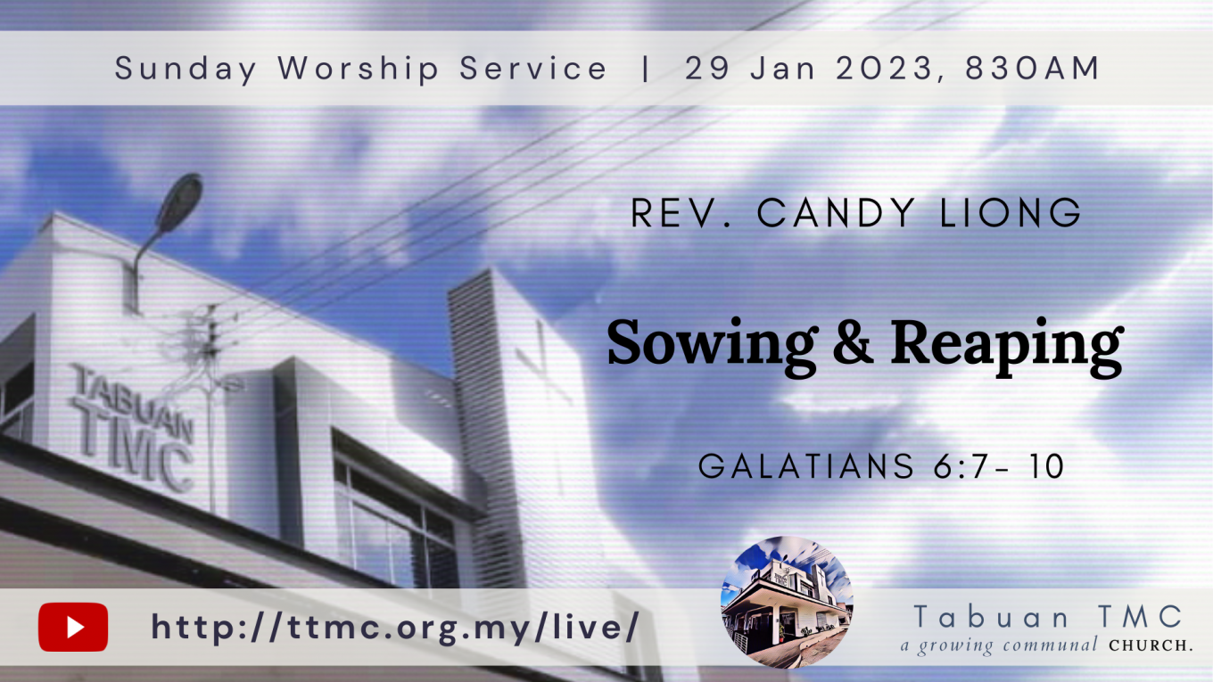 Date: 29.01.2023 Time: 8:30AM Preacher: Rev. Candy Liong Scripture Verses: Sowing and Reaping Sermon: Galatians 6:7 – 10 Worship Songs: