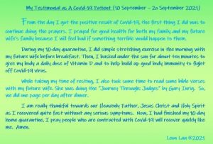 From Leon’s example, we can see how Covid has brought him and his loved one closer to God and to one another! Nothing, not even the pandemic, can stop us from worshiping God! – Rev. Candy Liong